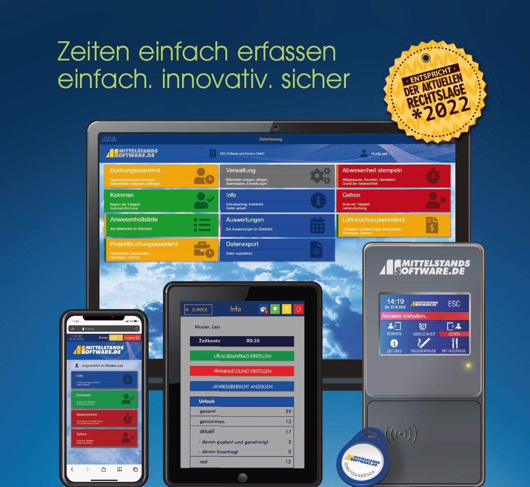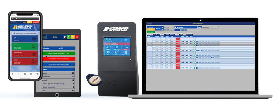 Mit M-ZEIT haben Sie eine moderne Zeiterfassungslösung zur Hand, die es einfach macht, „Kommen-Gehen“ und „Pausen“ zu erfassen. Die erfassten Arbeitszeiten dienen als wichtige Grundlage für die Lohnabrechnung und/oder zur Fakturierung von Aufträgen, indem Sie genau nachvollziehen können, wie viel Zeit für welche Arbeit aufgewendet wurde. Dabei können Sie das Gerät nutzen, das Ihnen gerade am besten passt, wie z.B. Smartphone, PC, PZE-Terminal oder Tablet.